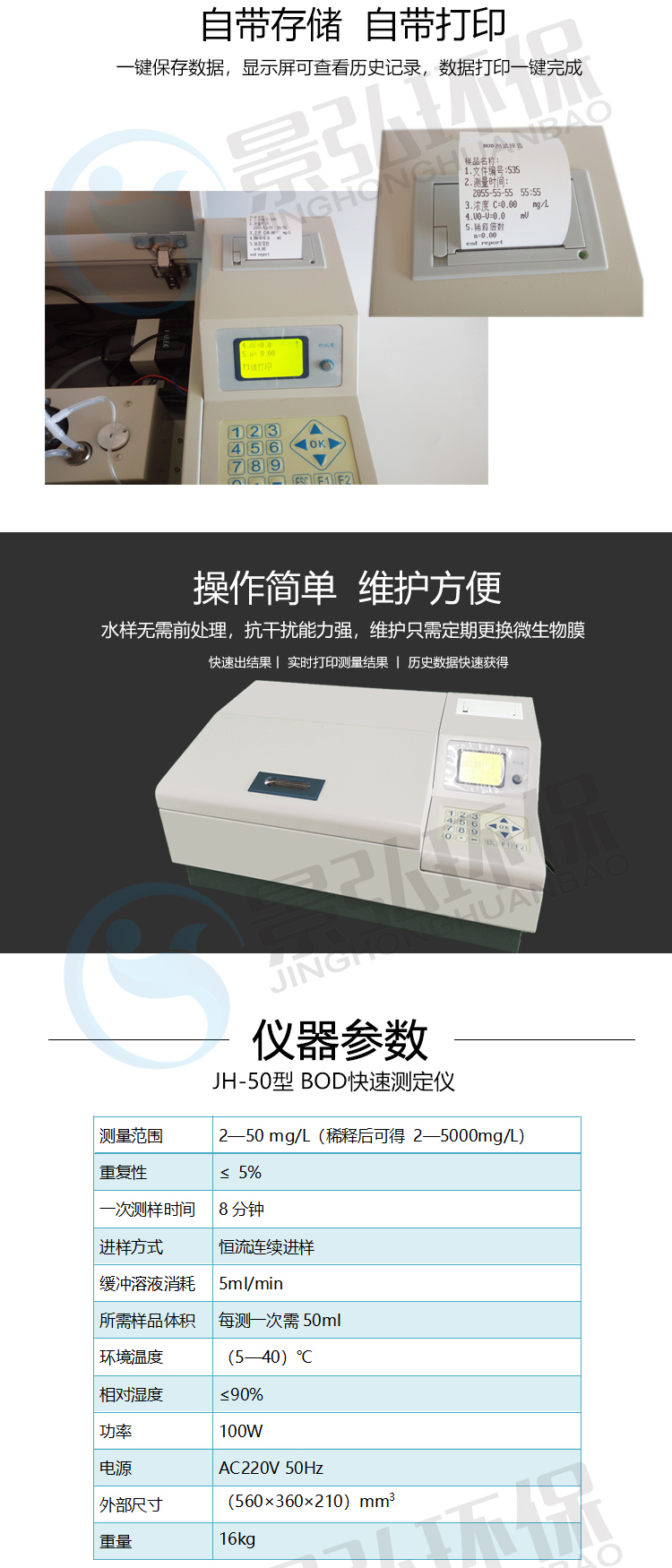 JH-50型BOD快速測定儀采用微生物電*法,能快速測定水樣中的BOD值,而且操作簡便,測量準確。其原理基于微生物對有機物的耗氧代謝,測定BOD只涉及到初始氧化速率,因而可在8-15分鐘內(nèi)完成一個樣品的測定。大大縮短了測定所需的時間。該方法符合《水質(zhì)生化需氧量(BOD)微生物傳感器快速測定法》(HJ/T86-2002),在2002年出版發(fā)行的《水和廢水檢測分析方法》(第四版)列為A類方法。